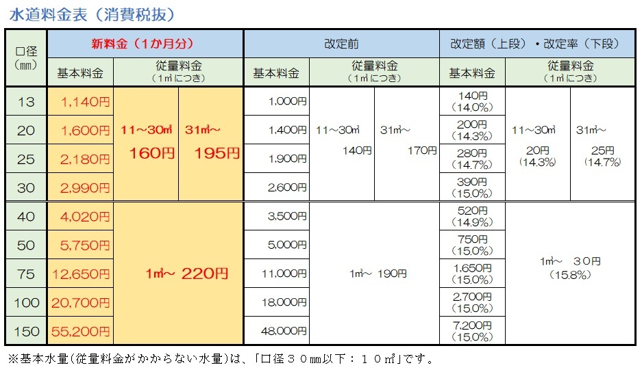 今回の改定により、一般家庭のモデルケースとして口径20mm、1か月20立方メートル使用で、400円(税抜)の引き上げとなります。