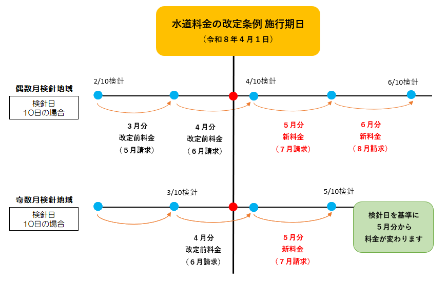 新料金の適用は、「令和8年5月分(7月請求)」からとなります。料金算定対象期間に令和8年3月が含まれる「4月分」は、改定前の料金となります。
