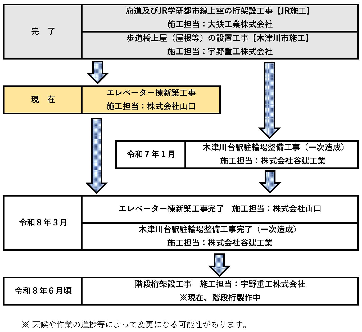 - 現在、エレベーター棟新築工事を実施しており、令和8年1月からは木津川台駅駐輪場の一次造成工事を進めていきます。