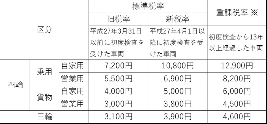 車両の種類や最初の新規検査(初度検査)年月によって、適用される税率が異なります。ただし、一部車両については軽課税率が適用されます。詳しくは次項「軽課税率について」を参照ください。