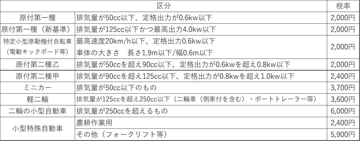 令和7年4月1日に原動機付自転車のうち、二輪のもので、総排気量が125cc以下かつ最高出力が4.0kw(50cc相当)以下のものに係る軽自動車種別割(税率2,000円)が新設されました。