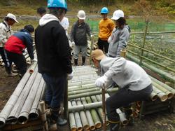 午前中に行ったベンチ作りの要領で今度はさらに多くの竹を組み立てます。