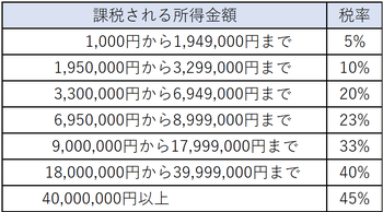 所得税の税率は、課税所得に応じて以下の表のとおりとなります。